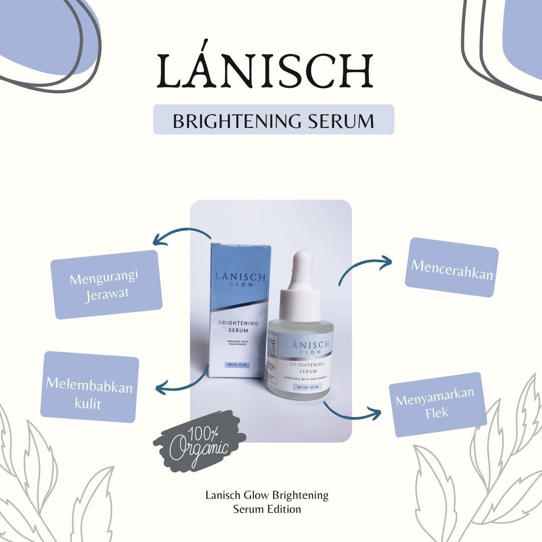 Lánisch glow serum brightening memiliki kandungan niacinamide, hydrolized collagen yang dapat menghilangkan flek hitam di wajah, mengurangi jerawat sehingga kulit wajah anda semakin bersih, cerah glowing dan kenyal dan ga kering lg.